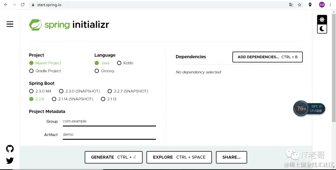 我们将项目信息填写好之后,点击generate按钮,将项目下载下来,导入idea