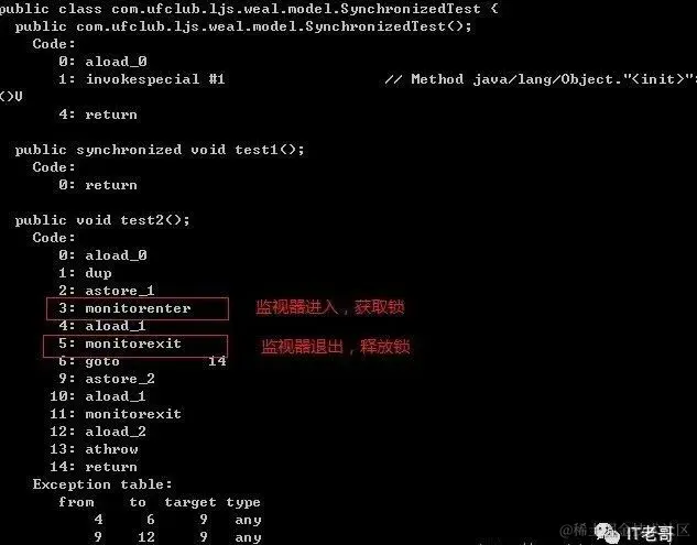当一个线程访问同步代码块时,需要获得锁才能执行,当退出或者抛出异常的时候要释放锁。那么是怎么实现的呢,我们来看一段代码