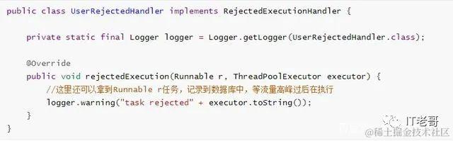 保存到数据库进行削峰填谷。在空闲时再提出来执行。转向某个提示页面打印日志自定义拒绝策略: