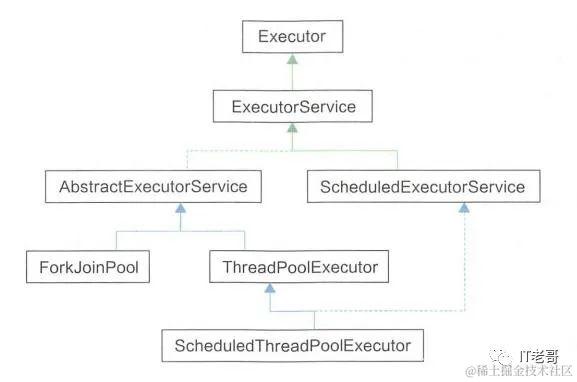 ExecutorService接口继承了Executor接口,定义了管理线程任务的方法。ExecutorService的抽象类AbstractExecutorService提供了submit、invokeAll()等部分方法实现,但是核心方法Executor.execute()并没有实现。因为所有任务都在这个方法里执行,不同的线程池实现策略会有不同,所以交由具体的线程池来实现。