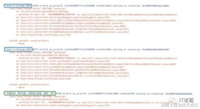 如上代码所示,实现ThreadFactory接口并在newThread方法中实现设置线程的名称、是否为守护线程以及线程优先级等属性。这样做有助于快速定位死锁、StackOverflowError等问题。如下图所示,绿色框自定义的线程工厂明显比蓝色的默认线程工厂创建的线程名称拥有更多的额外信息。