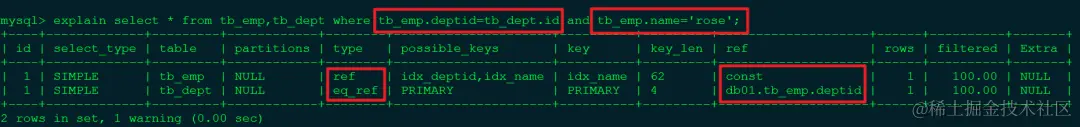 - tb_emp 表为非唯一性索引扫描,实际使用的索引列为 idx_name,由于 tb_emp.name='rose'为一个常量,所以 ref=const。