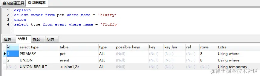 如果有两个 select 查询语句,他们之间用 union 连起来查询,那么第二个 select 会被标记为 union,union 的结果被标记为 union result。它的 id 是为 null 的
