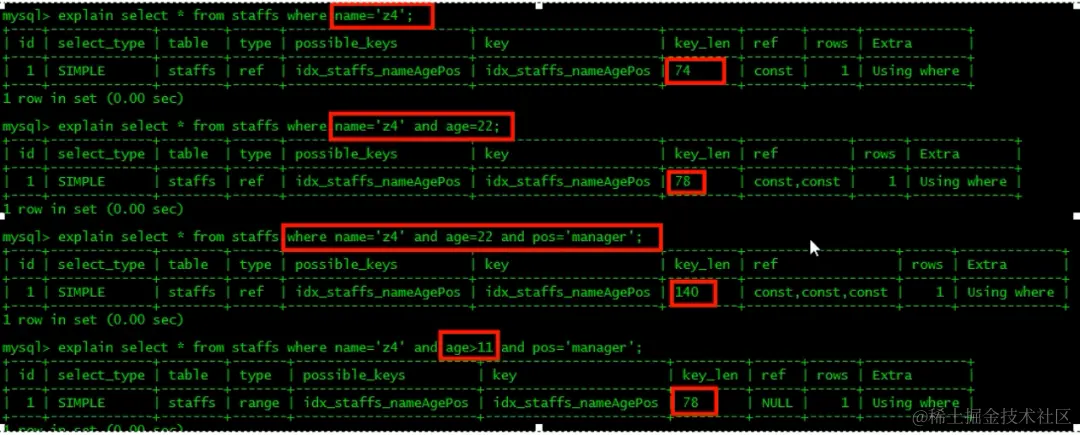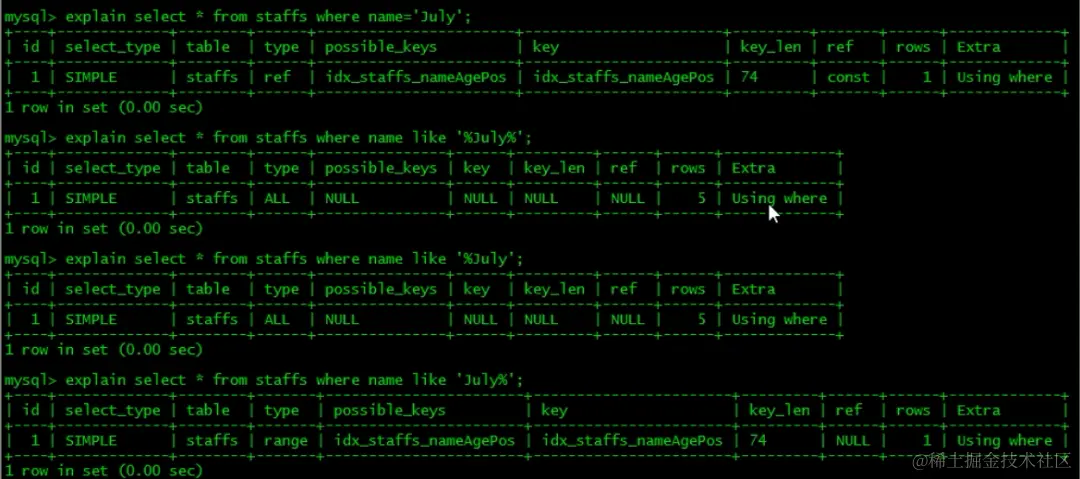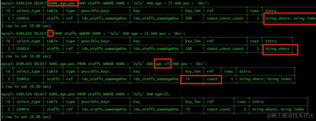即:select 查询字段和 where 中使用的索引字段一致。