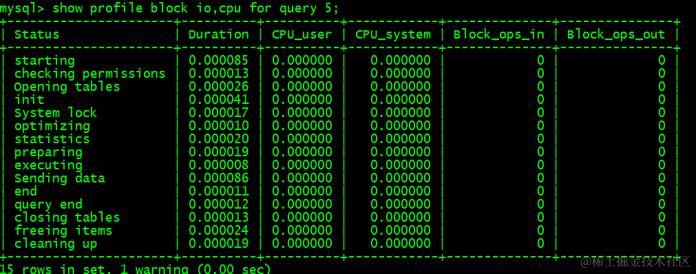 show profile cpu,block io for query 5
