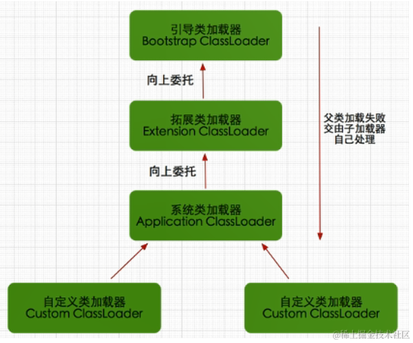 (1)如果一个类加载器接收到了类加载的请求,它自己不会先去加载,会把这个请求委托给父类加载器去执行。