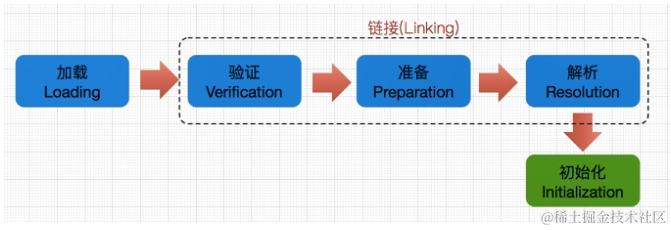 链接是指将上面创建好的class类合并至Java虚拟机中,使之能够执行的过程,可分为验证、准备、解析三个阶段。