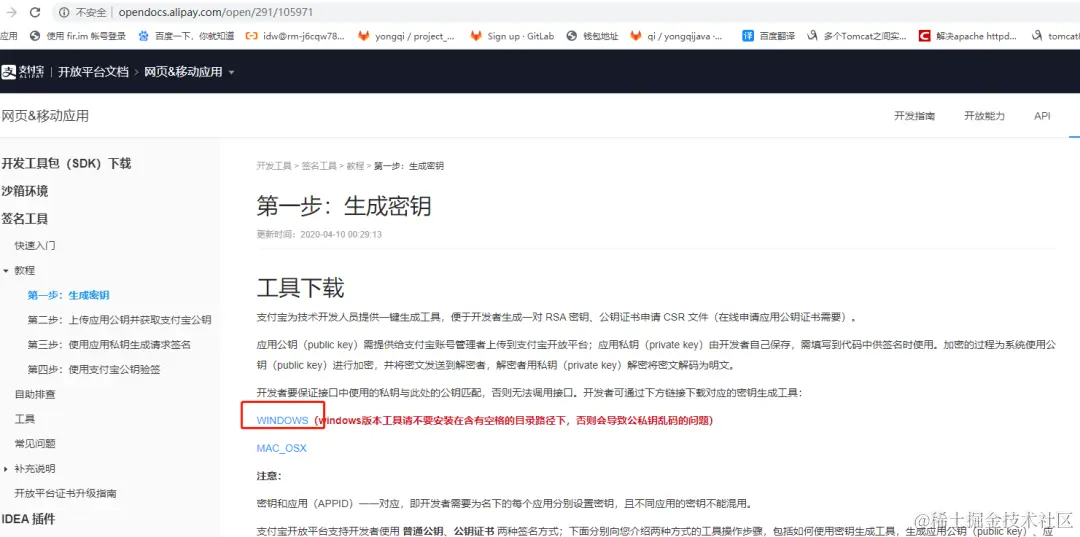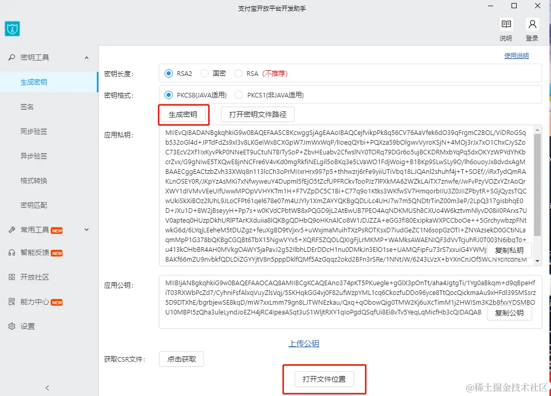 打开页面 opendocs.alipay.com/open/291/10… 下载公私钥生成工具,安装后生成应用的公钥和私钥
