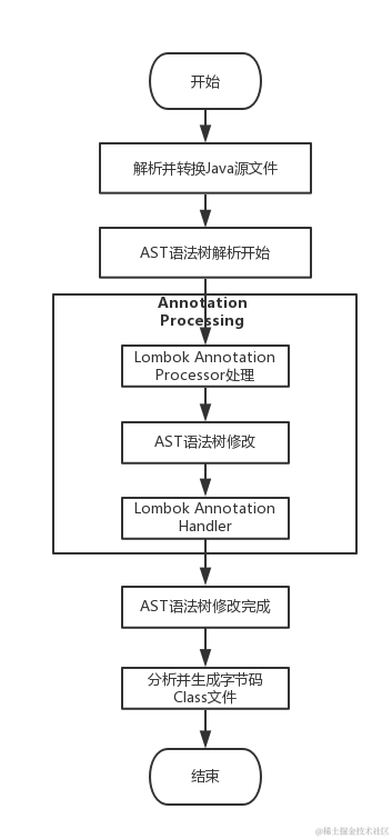从上面的这个原理图上可以看出 Annotation Processing 是编译器在解析 Java 源代码和生成 Class 文件之间的一个步骤。其中 Lombok 插件具体的执行流程如下: