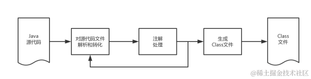 在 Javac 编译阶段利用“Annotation Processor”,对自定义的注解进行预处理后生成真正在 JVM 上面执行的“Class文件”。有兴趣的同学反编译带有 Lombok 注解的类文件也就一目了然了。其大致执行原理图如下: