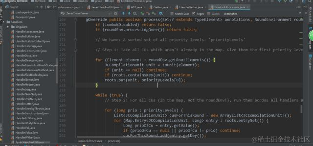 在 LombokProcessor 处理器中,其中的process方法会根据优先级来分别运行相应的 handler 处理类。Lombok 中的多个自定义注解都分别有对应的 handler 处理类,如下图所示: