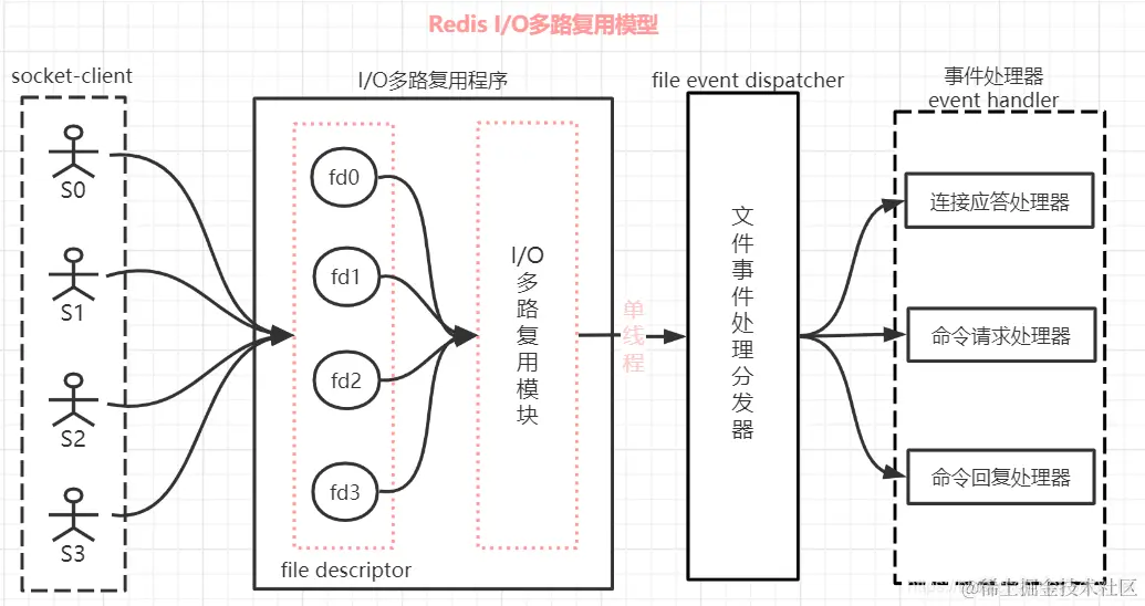 这里“多路”指的是多个网络连接客户端,“复用”指的是复用同一个线程(单进程)。I/O 多路复用其实是使用一个线程来检查多个Socket的就绪状态,在单个线程中通过记录跟踪每一个socket(I/O流)的状态来管理处理多个I/O流。如下图是Redis的I/O多路复用模型: