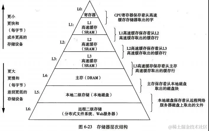 借了一张《深入理解计算机系统》的图,展示了一个典型的存储器层次结构,在L0层,CPU可以在一个时钟周期访问到,基于SRAM的高速缓存春续期,可以在几个CPU时钟周期访问到,然后是基于DRAM的主存,可以在几十到几百个时钟周期访问到他们。