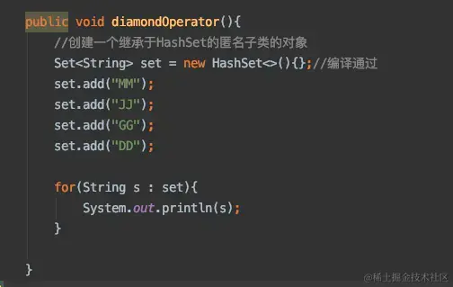 钻石操作符,是官方给出的说法,其实就是之前版本的泛型操作符,图中的代码在java8中是编译不通过的,但是java9可以,这个主要涉及到匿名子类的时候