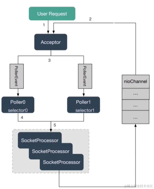 - Pollerthread将nioChannel注册到它的选择器IO事件