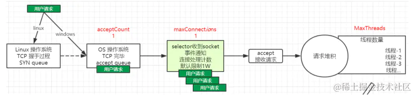 前面说到在linux系统中会有所不同,因为linux会在SYN队列堆积一些三次握手过程中的请求,所以它的受理请求应该是 (connections + acceptCount + SYN队列容量)