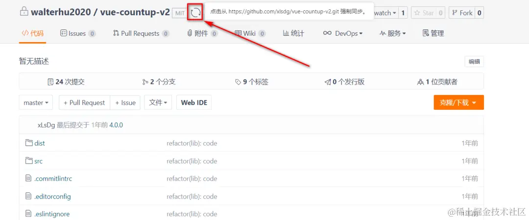 等待导入操作完成,然后在导入的仓库中下载浏览对应的该 GitHub 仓库代码,你也可以点击仓库顶部的“刷新”按钮进行 Github 代码仓库的同步。