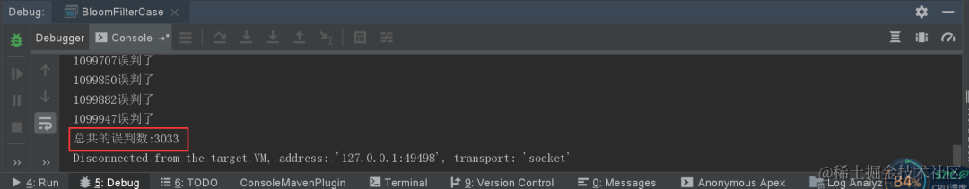 10万数据里有947个误判,约等于0.01%,也就是我们代码里设置的误判率:fpp = 0.01。