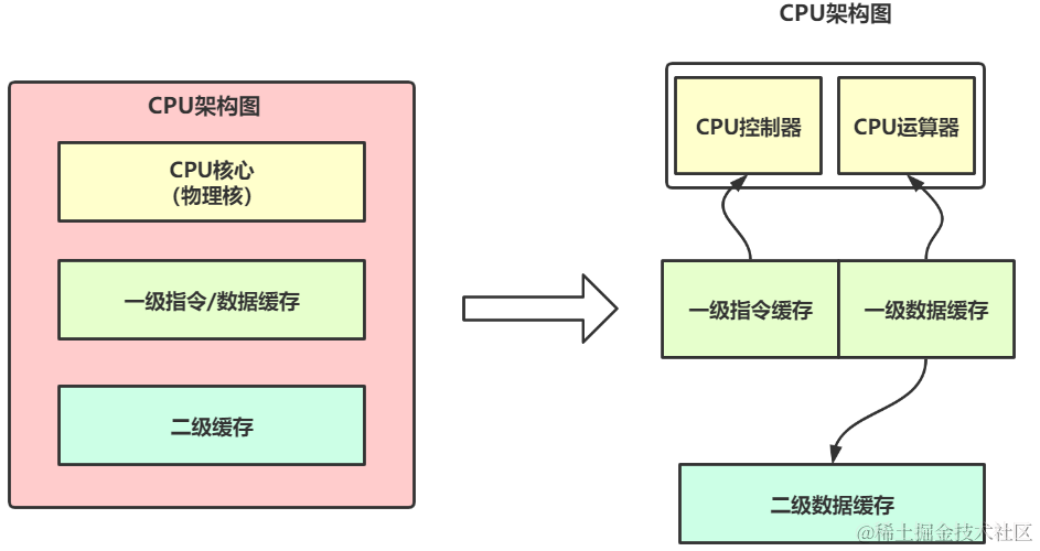 对于 L1 缓存和 L2 缓存,在每个物理核上都是独自拥有的,访问速度非常快,基本都在 ns 级别。我们设想如果把数据运行的指令放在这两个缓存上,那么可以大大提高计算机的访问性能。