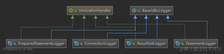 问题是应该怎么优雅地增强这些方法呢?Mybatis使用了动态代理来实现。在日志模块下的JDBC包就是代理类的实现,先来看看类图: