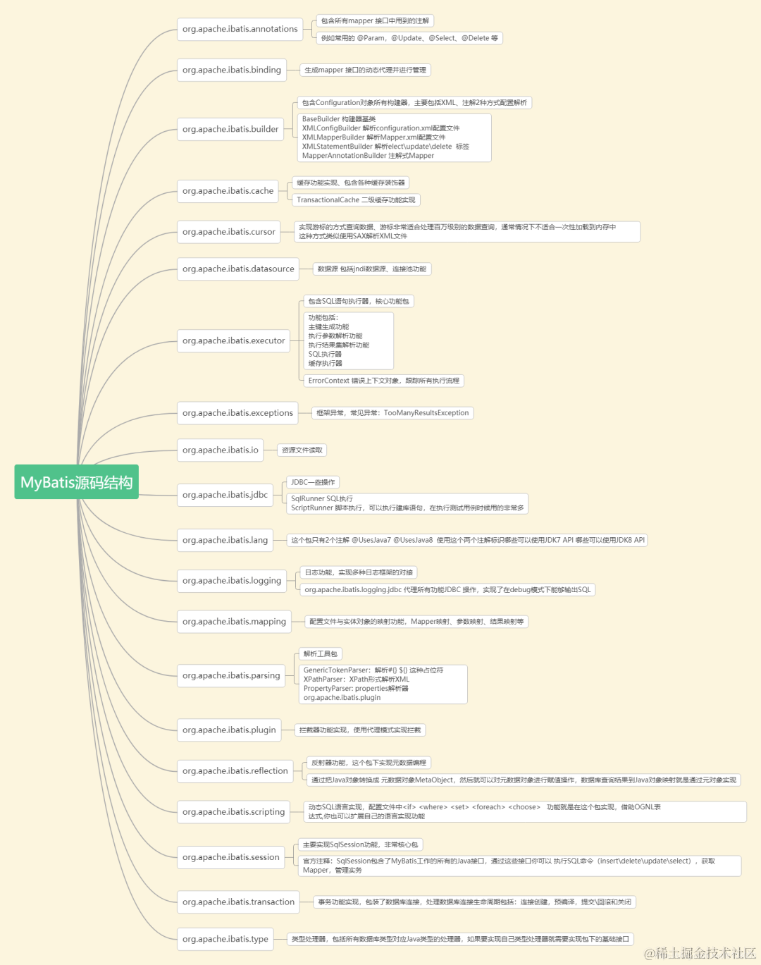 Mybatsi的源码相较于Spring源码无论是架构还是实现都简单了很多,它所有的代码都在一个工程里面,在这个工程下分了很多包,每个包分工都很明确: