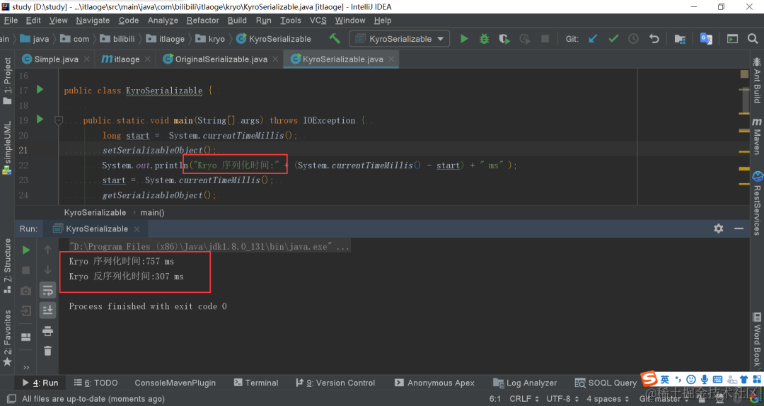 System.out.println("Kryo 序列化时间:" + (System.currentTimeMillis() - start) + " ms" );