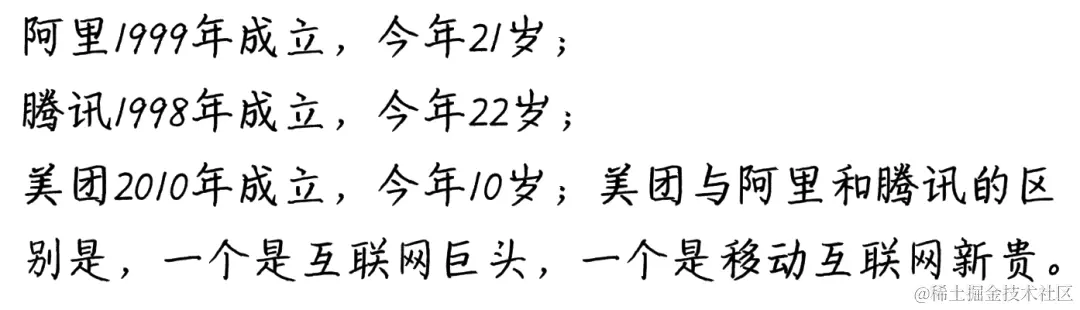 最后,总结一下三家大厂,阿里和腾讯是老牌互联网大厂,美团是年轻互联网大厂。
