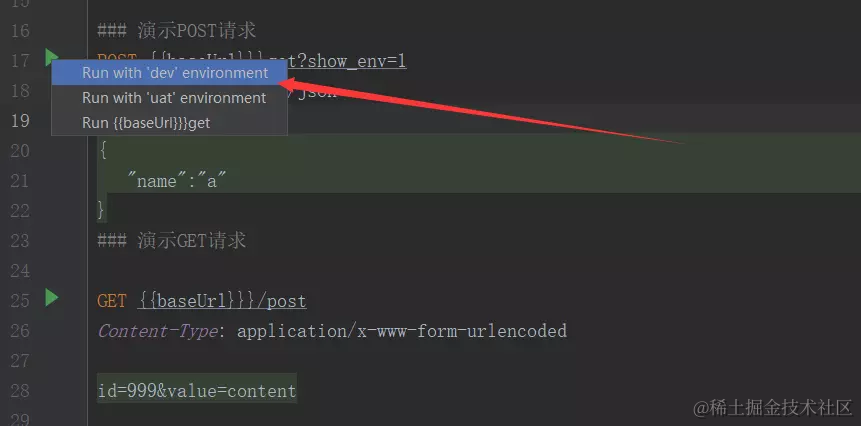 这个就是IDEA REST Client真香的地方,支持从指定的配置文件中获取到环境相关的配置参数,不仅baseUrl可以通过占位符替换,一些请求的参数如果和接口环境相关的都可以通过配置文件来区分。