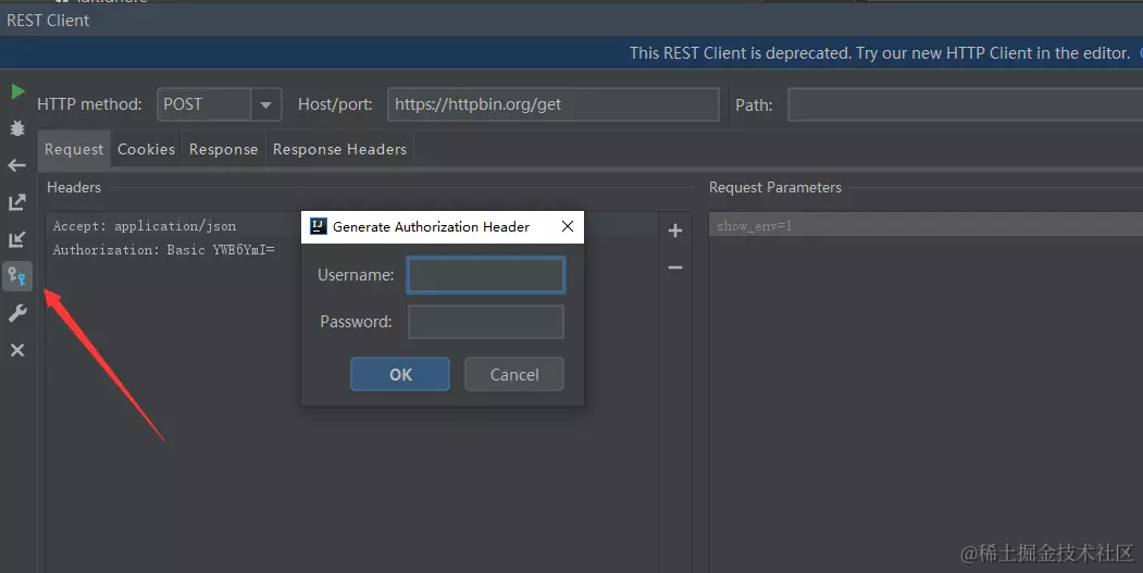 特别说明下的是,如果请求的方式是Authorization:Basic这种方式认证的话,可以点击下图所示的按钮,会弹出填充用户名和密码的窗口出来,填完后会自动补充到Authorization 的header里面去