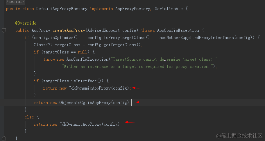 2.如果目标对象有实现接口,使用jdk代理。如果目标对象没有实现接口,则使用Cglib代理。然后从容器获取代理后的对象,在运行期植入"切面"类的方法。通过查看Spring源码,我们在DefaultAopProxyFactory类中,找到这样一段话。