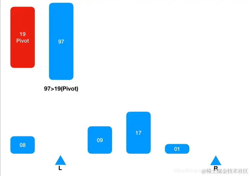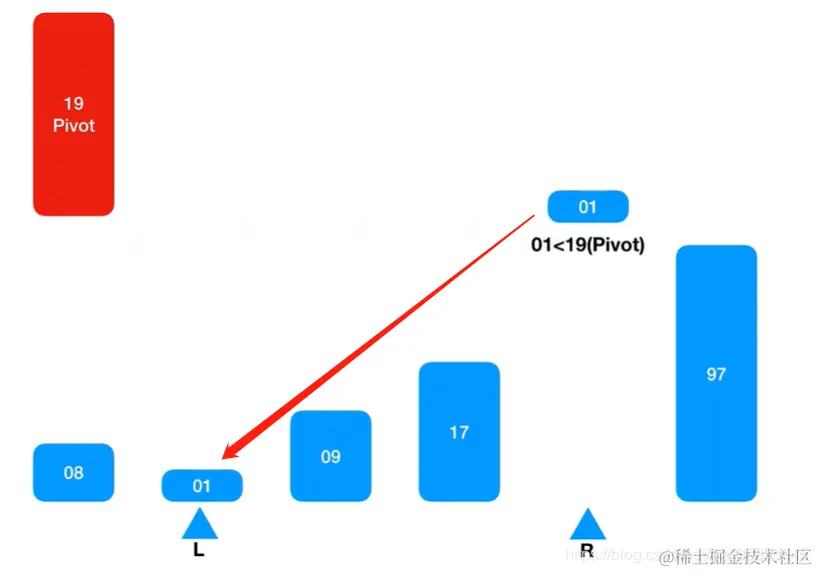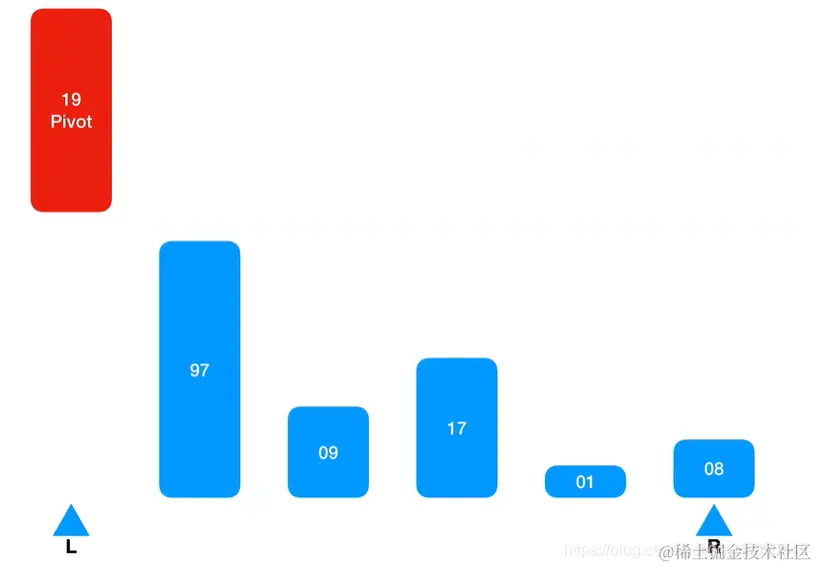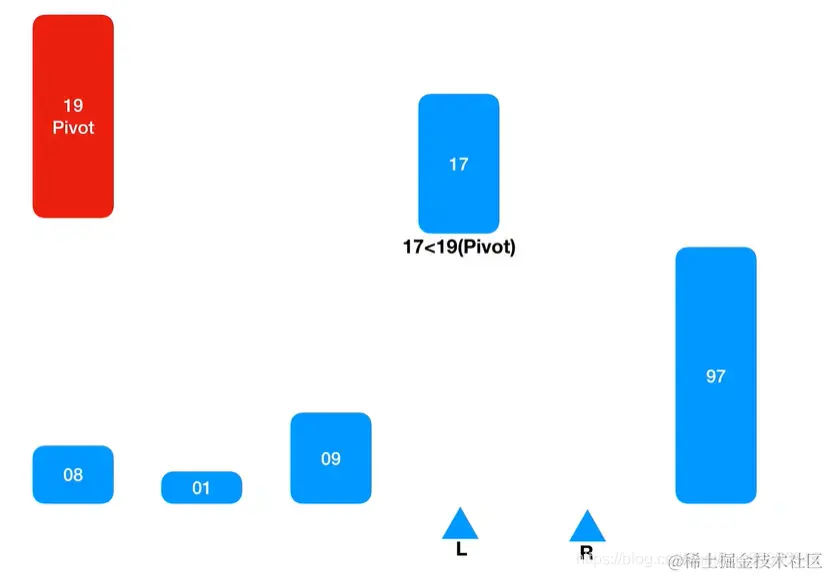 8.继续从左边坐标 + 1 取值继续匹配,则取到Arr[L] = 17,又小于基准值,则忽略并跳过,继续找Arr[L + 1]继续匹配。