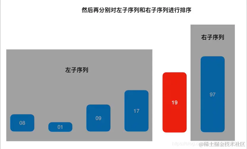- 4.第一次排序结束后,分别对左右子序列继续递归重复前三步操作。