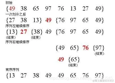 从排序数组中找出一个数,可以随机取,也可以取固定位置,一般是取第一个或最后一个,称为基准数。然后将比基准小的排在左边,比基准大的放到右边;
