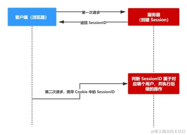 - cookie 存储在客户端: cookie 是服务器发送到用户浏览器并保存在本地的一小块数据,它会在浏览器下次向同一服务器再发起请求时被携带并发送到服务器上。
