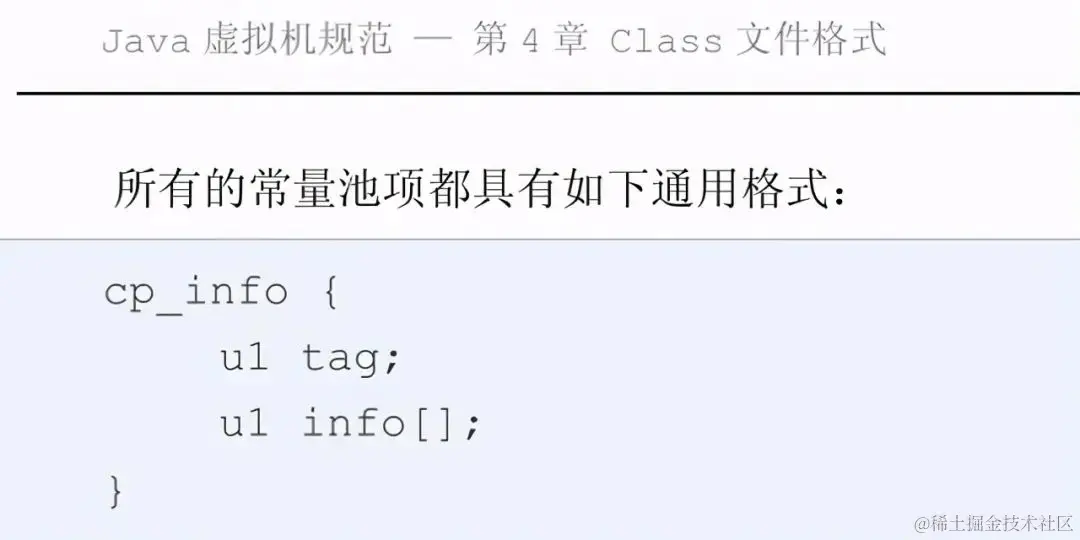 常量池中,每个 cp_info 项的格式必须相同,它们都以一个表示 cp_info 类型的单字节 “tag”项开头。后面 info[]项的内容 由tag 的类型所决定。