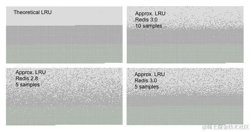 我们可以通过一个实验对比各LRU算法的准确率,先往Redis里面添加一定数量的数据n,使Redis可用内存用完,再往Redis里面添加n/2的新数据,这个时候就需要淘汰掉一部分的数据