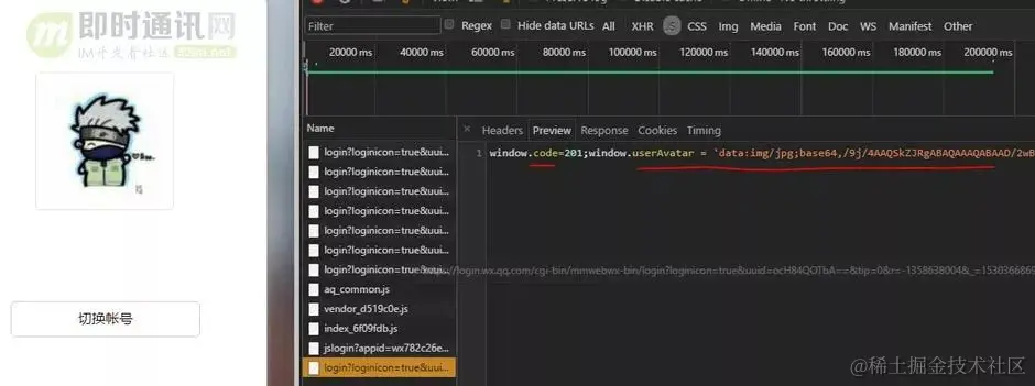 201 已扫码:如果手机已经扫码,服务器立即返回状态码和用户的基本信息 (window.code=201,window.code.userAvator="…"),-> 前端继续轮询