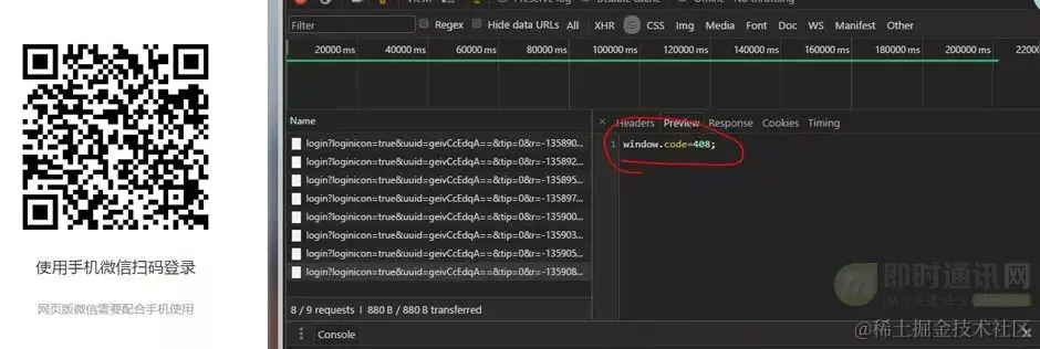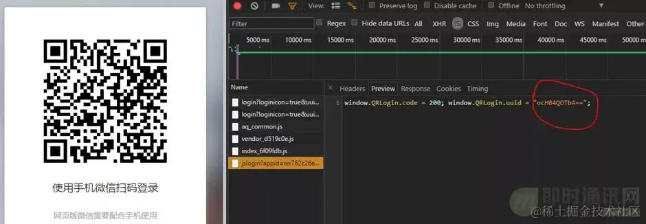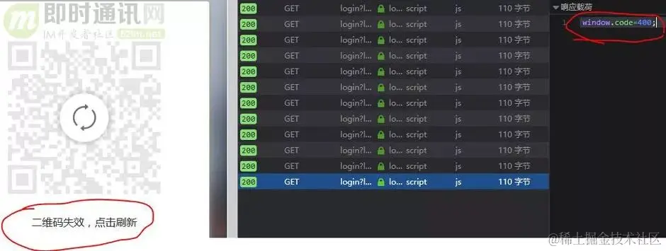 微信网页端扫码登录时,轮询的数据返回采用的是JSONP的形式,这是为了解决跨域问题。如对JSONP不了解的,可以参考: