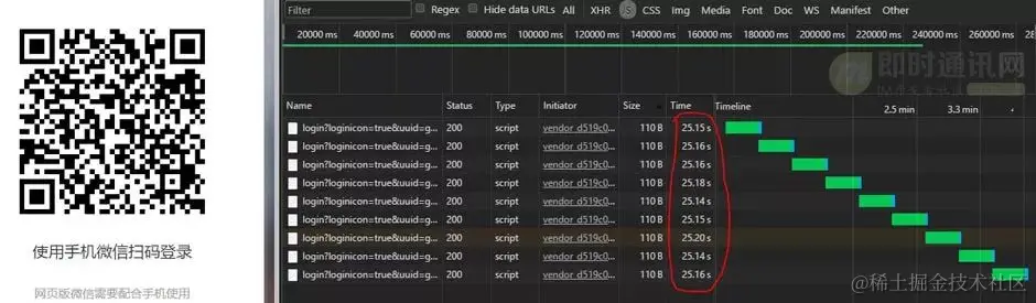 408 扫码超时:如果手机没有扫码或没有授权登录,服务器会阻塞约25s,然后返回状态码 408 -> 前端继续轮询