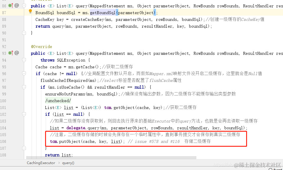 - 3、如果没有获取到二级缓存则执行被包装的Executor对象中的query方法,此时会走一级缓存中的流程。