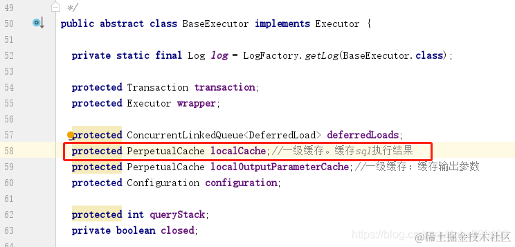 看到果然有一个localCache。而上面我们有提到PerpetualCache内缓存是用一个HashMap来存储缓存的,那么接下来大家肯定就有以下问题: