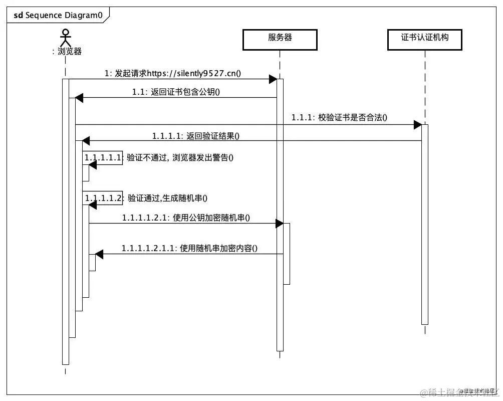 - 如果证书合法浏览器生成随机串,使用公钥加密发送给服务器,服务器使用私钥解密出随机串,服务器使用随机串加密内容返回给客户端