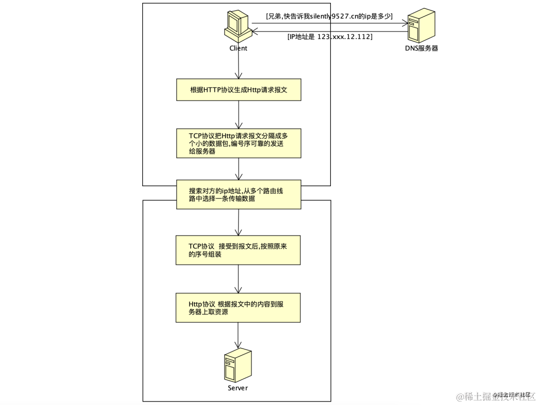 首先浏览器会去访问DNS服务器,查询到域名对应的ip地址是多少,然后浏览器再去访问这个ip地址;如果还要往底层在说的话,就会涉及到tcp/ip的分层,我还是来画张图吧。