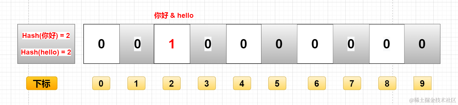 例如图中的“你好”和“hello”,假如最终算出hash值相同,那么他们会将同一个下标的二进制数据改为1。