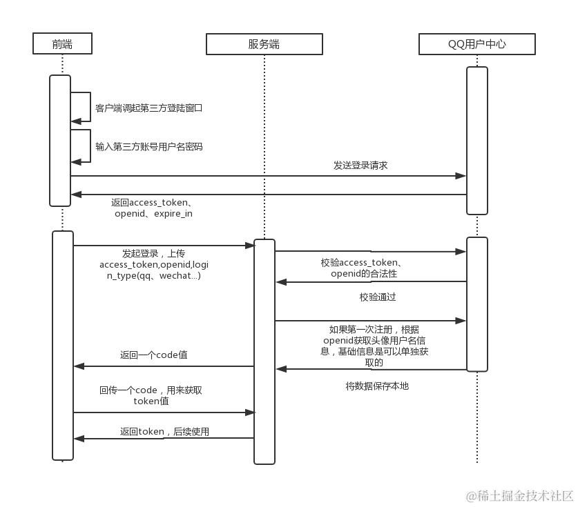 - 客户端拿到access_token、openid、login_type(qq、wechat...)请求应用服务器,应用服务器拿到这些数据后就会根据对应的login_type去对应的用户中心进行access_token和openid进行校验。校验不通过则返回对应错误码