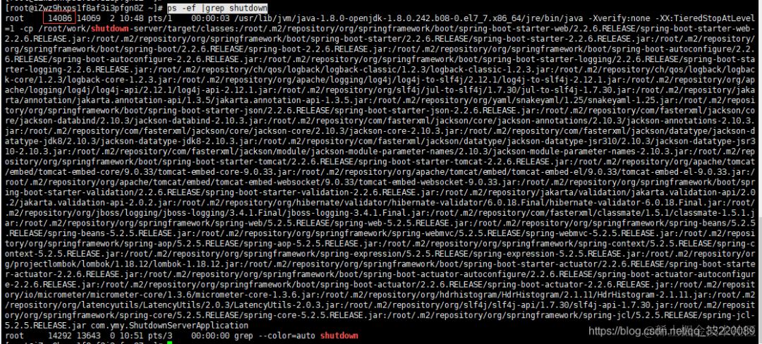这个就是项目的进程号,接下来我们先测试test接口,让线程进入休眠状态,然后再使用kill -15 14086停止项目