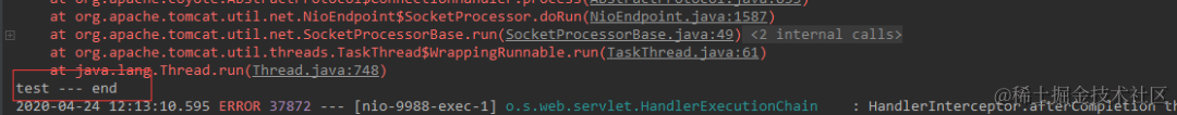 2020-04-24 10:54:04.610 ERROR 14086 --- [nio-9988-exec-1] o.s.web.servlet.HandlerExecutionChain : HandlerInterceptor.afterCompletion threw exception