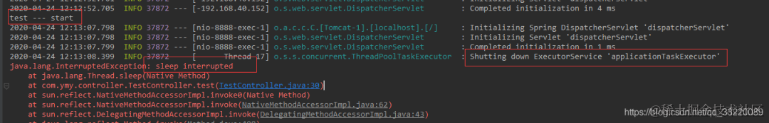 这样我们就配置好了,我们再来测试一遍,test的接口还是休眠10秒我们发现这次没有报错了,他是等待了一段时间之后再结束的线程池,这个时间就是我们在ElegantShutdownConfig类中配置的waitTime。