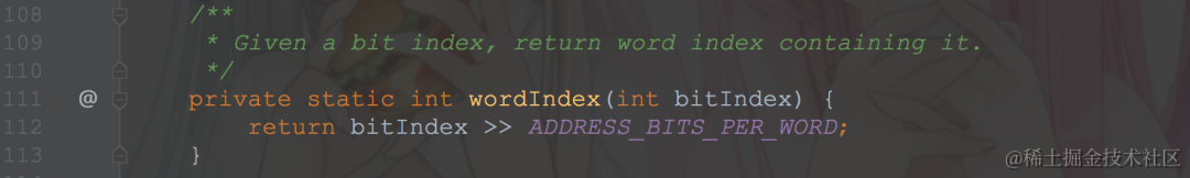 这就是我们前面所说的了,int数组中的一个元素是4字节占32位,那么除以32就知道元素的下标,对32求余数(%32)就知道它在哪一位,如果该位是1,则表示存在。