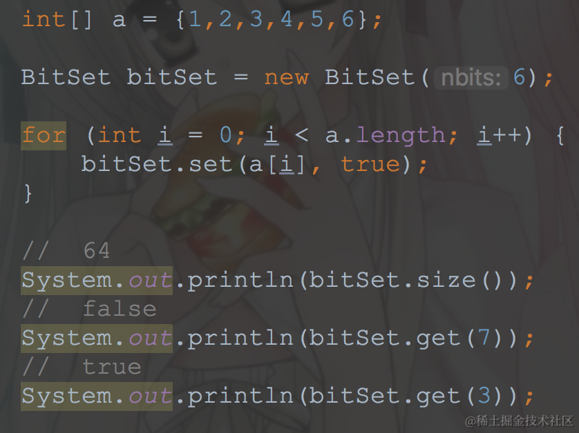 用一个long数组来存储,初始长度64,set值的时候首先右移6位(相当于除以64)计算在数组的什么位置,然后更改状态位
